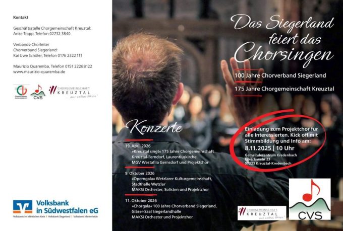 (wS/ck) Kreuztal 28.10.2025 | Im kommenden Jahr begeht der Chorverband Siegerland sein 100-jähriges Bestehen. Gemeinsam mit der Chorgemeinschaft Kreuztal, die...