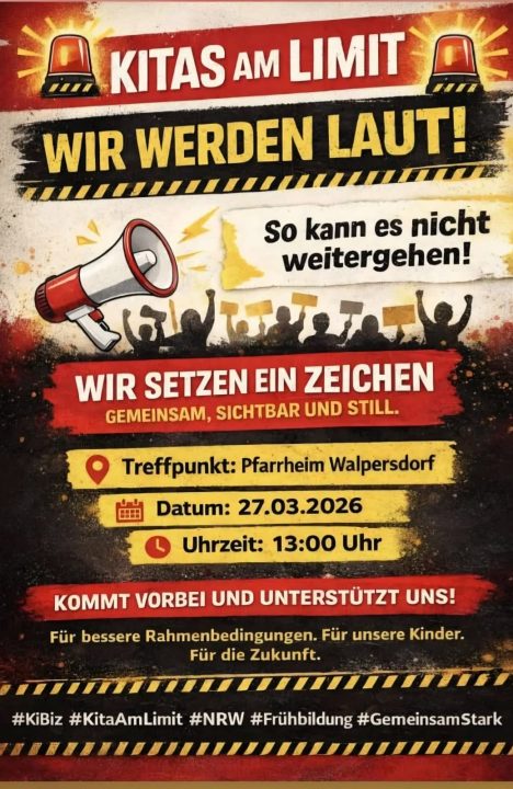 27. März 2026(wS/red) Netphen 27.03.2026 | Der Druck im Kesselsystem der nordrhein-westfälischen Kinderbetreuung hat den Siedepunkt erreicht. Unter dem Motto „Kitas am Limit – Wir...