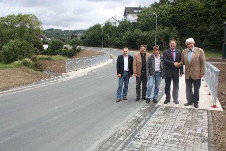 Eröffnung der ausgebauten K 11 an der Brücke über den Werthenbach (v.r.): Landrat Paul Breuer, Bürgermeister Paul Wagener, Josef Bauer (Bauleiter, Firma Baustra), Gerhard Linde (Projektleiter Landesbetrieb Straßen.NRW) und Ulrich Schmelzer (Kreisverwaltung).