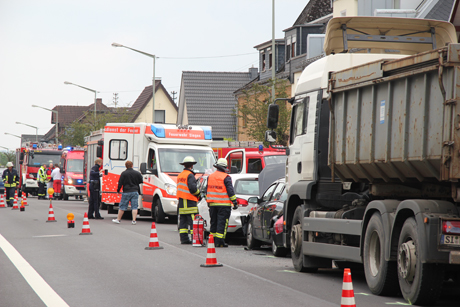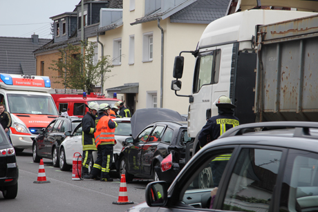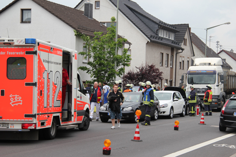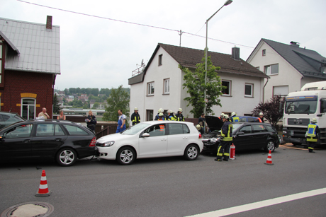 wS/wf. Kreuztal – 14.06.2012 – Drei PKW und ein LKW waren am Donnerstagnachmittag kurz vor 14:00 Uhr in einen Verkehrsunfall verwickelt, der aufgrund erster unklarer Meldungen einen Großeinsatz von Feuerwehr und Rettungsdienst in Gang setzte.