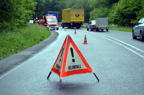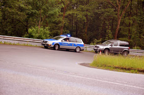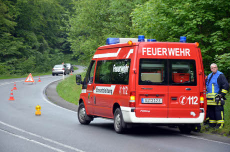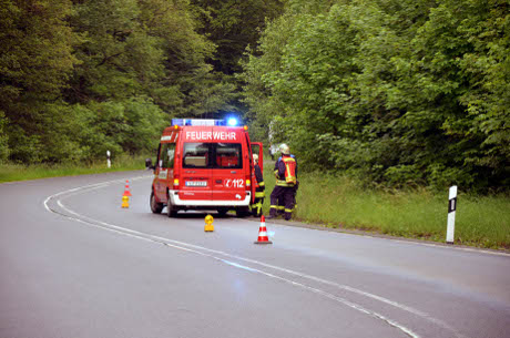 wS/wf. Netphen-Afholderbach. – 01.06.2012 – Zu einer kilometerlangen Ölspur wurde am späten Freitagnachmittag die Feuerwehr auf die Bundesstraße 62 gerufen. Schon kurz hinterm Ortsausgang von Afholderbach zog sich die über einen Meter breite Öl- oder Dieselspur bis in den Bereich der Applauskurve. Polizei und Feuerwehr sicherten die Einsatzstelle mit Leuchten, Schildern und Verkehrsleitkegel (Warnhüten) ab. Da die Feuerwehr hier kein Bindemittel abstreuen konnte, wurde die Fachfirma Dietrich aus Kaan-Marienborn mit der Beseitigung der Ölspur beseitigt. Wegen dem Verursacher ist die Polizei noch am Ermitteln. Die Feuerwehr und Polizei sicherte die Einsatzstelle der kilometerlangen Ölspur ab.