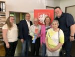 Dirk Roth vom TuS Vormwald, Bürgermeister Kyrillos Kaioglidis, Ulrike Schindler vom Heimatverein Vormwald, Heike Rill vom AWO-Kindergarten und Peter Roth von der Löschgruppe Vormwald bei der feierlichen Eröffnung des neuen Dorfplatzes