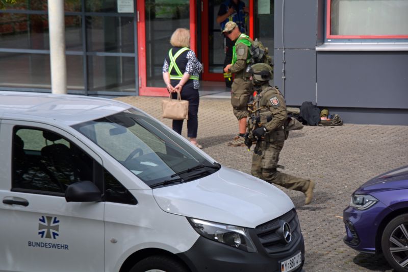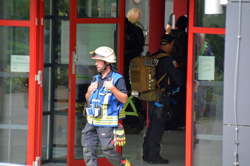 (wS/si) Burbach 25.08.2023 | Schüsse aus dem Schulgebäude, laute Rufe, Personen, die an die Fenster klopfen – diese dramatischen Szenen waren jetzt an der Gemeinschaftlichen Sekundarschule in Burbach zu beobachten. In Gefahr hat sich dabei aber niemand befunden, das Szenario wurde zu Übungszwecken nachgestellt.