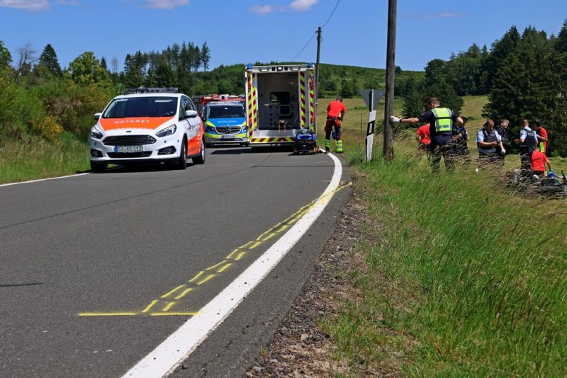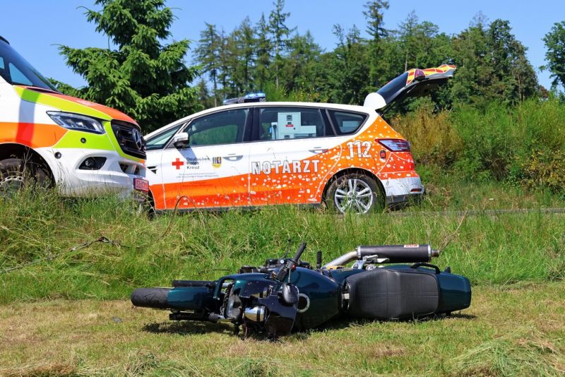 (wS/red) Bad Laasphe 20.06.2025 | Ein schwerer Motorradunfall auf der Kreisstraße 53 (K53) zwischen Bad Laasphe und Richstein hat am Donnerstagmittag für einen Großeinsatz von Rettungskräften gesorgt. In Höhe der Gemarkung Harfeld kam ein Motorradfahrer nach rechts von der Fahrbahn ab und prallte gegen einen Telefonmast. Dabei erlitt der Mann zunächst lebensgefährliche Verletzungen.