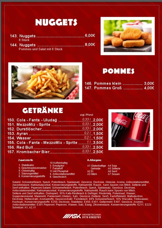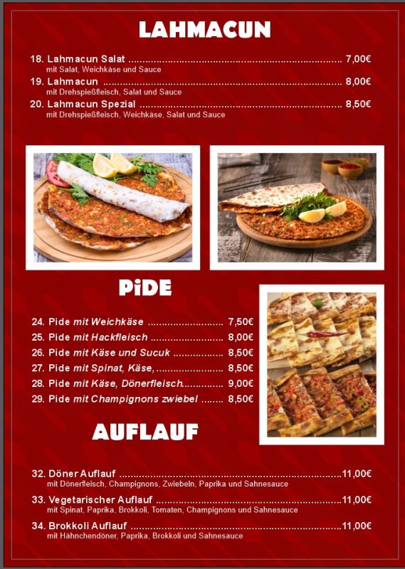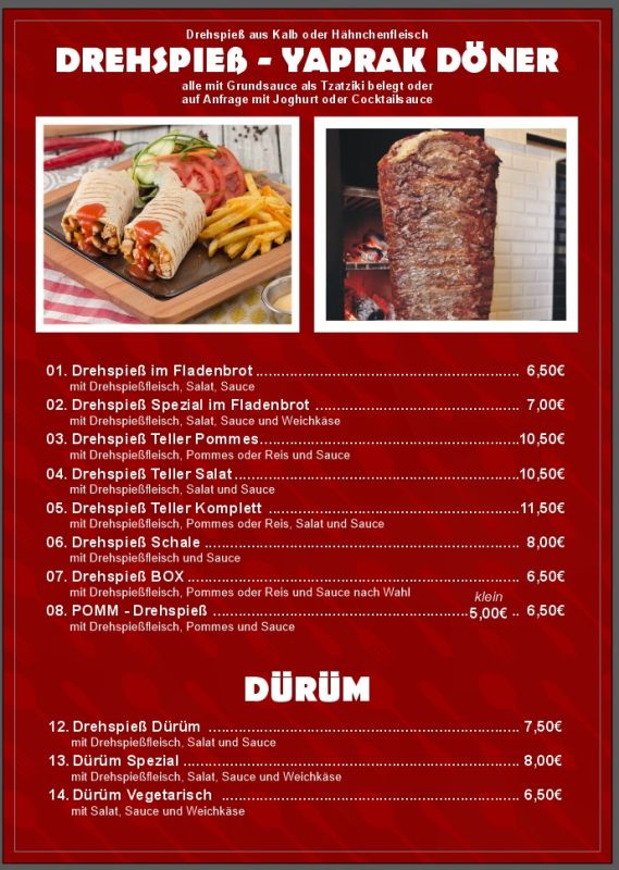 Zum Eröffnungstag erwartet die Gäste ein besonderes Angebot: Döner für nur 2,00 €! Zudem gibt es wöchentlich wechselnde Tagesangebote sowie vielfältige Gerichte von Döner über Pizza, Schnitzel und Pasta bis hin zu Lahmacun, Pide und Aufläufen – alle Speisen sind zum Mitnehmen oder direkt vor Ort zu genießen.