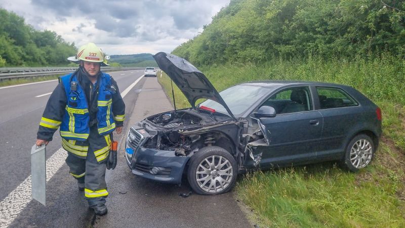 Ein Lkw hatte beim Ausscheren auf die linke Spur einen Audi geschnitten, der daraufhin mit dem Heck des Lkw kollidierte, die Kontrolle verlor und im Graben landete. Der 24-jährige Pkw-Fahrer aus Drolshagen blieb unverletzt, der Rettungsdienst konnte die Einsatzstelle rasch wieder verlassen. Die Feuerwehr (nur Krombach vor Ort, Kreuztal konnte den Einsatz unterwegs abbrechen) sicherte das Fahrzeug und konnte ebenfalls rasch wieder abrücken. Der Lkw war von der Unfallstelle geflüchtet.