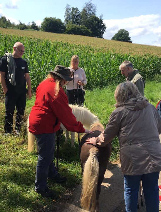 Die Sozialen Dienste laden alle zwei Monate zu einer gemeinsamen Aktivität ein. Zusammen mit Tanja Ebbinghaus und ihren zwei Miniponys Diego und Cameo spazierten sie einen Rundweg durch das idyllische Tal in Buchen entlang- vorbei an Kuhweiden und Obstbäumen, welche ein perfektes Schattenplätzchen für Pausen boten. Jeder, der sich traute, durfte die Ponys auch eine Zeit lang selber führen.