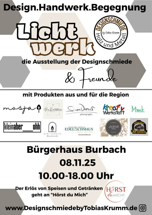 (wS/bu) Burbach 17.10.2025 | Am Samstag, 8. November 2025 verwandelt sich das Bürgerhaus Burbach von 10 bis 18 Uhr in einen Ort voller Kreativität und handwerklicher Leidenschaft. Unter dem Titel „LICHTWERK“ lädt die Designschmiede Holz und Metall von Tobias Krumm aus Gilsbach gemeinsam mit zehn befreundeten Kunsthandwerkerinnen und -handwerkern aus der Region zu einer besonderen Ausstellung ein, die Tradition, Design und Nachhaltigkeit auf inspirierende Weise verbindet.
