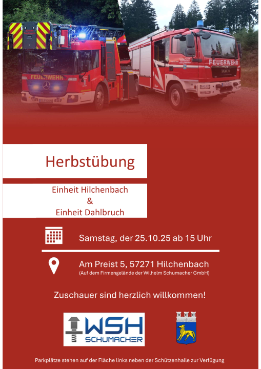 (wS/red) Hilchenbach 19.1.2025 | Am Samstag, den 25. Oktober 2025, um 15.00 Uhr, findet die gemeinsame Herbstabschlussübung der Löschgruppen Hilchenbach und Dahlbruch der Freiwilligen Feuerwehr der Stadt Hilchenbach sowie der DLRG statt. Übungsort ist das Gelände der Schraubenfabrik Wilhelm Schumacher GmbH, Am Preist 5 in Hilchenbach.