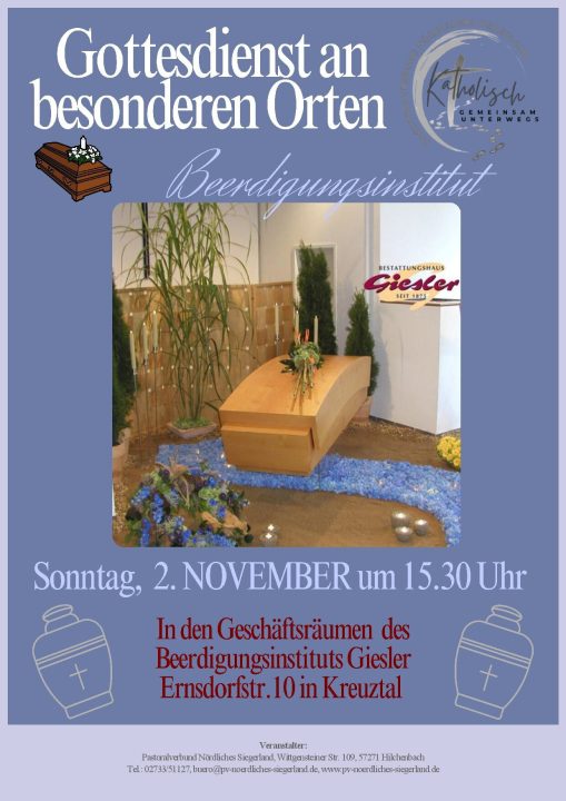 Der nächste dieser „Gottesdienste an besonderen Orten“ findet am Sonntag, 2. November, um 15.30 Uhr in den Geschäftsräumen des Beerdigungsinstituts Giesler, Ernsdorfstr. 10 in Kreuztal statt. Im Mittelpunkt des Gottesdienstes im Trauermonat November und den Verstorbenen-Gedenktagen Allerheiligen, Allerseelen und Totensonntag steht diesmal ein Ort, an dem sich Tod und Leben in besonderer Weise begegnen. Hier kommen Sterben und Begrenztheit, Trauer und Tränen zur