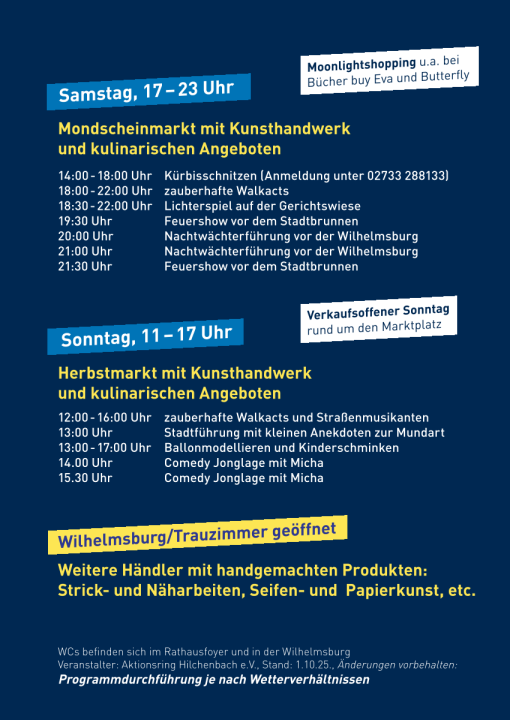 (wS/red) Hilchenbach 16.10.2025 | Am Freitag, 25. Oktober, verwandelt sich die Hilchenbacher Stadtmitte wieder in ein farbenfrohes Lichtermeer: Der beliebte Mondscheinmarkt lädt von 17:00 bis 23:00 Uhr zu einem stimmungsvollen Abendbummel ein. Zwischen bunt beleuchteten Fachwerkfassaden erwartet die Besucherinnen und Besucher ein herbstlicher und kulinarischer Markt im Mondschein.