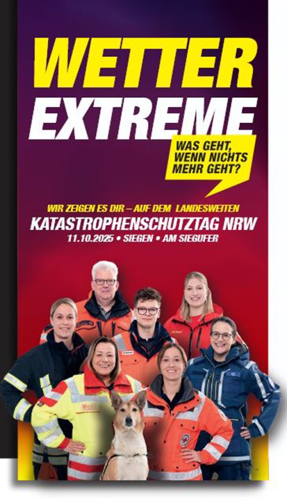 (wS/nrw) Siegen 06.10.2025 | Am Samstag, den 11. Oktober 2025, wird Siegen zum Schauplatz des landesweiten Katastrophenschutztages Nordrhein-Westfalen. Die Veranstaltung, die unter dem Motto „Wetterextreme – Was geht, wenn nichts mehr geht?“ steht, lädt die Bevölkerung von 10:00 bis 17:00 Uhr dazu ein, sich umfassend über den Bevölkerungsschutz und das Ehrenamt zu informieren.