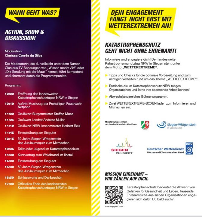 - 10:00 Uhr: Offizielle Eröffnung des landesweiten Katastrophenschutztages NRW in Siegen.