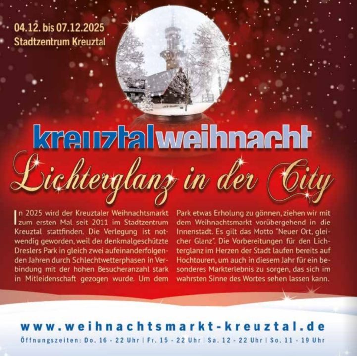 (wS/red) Kreuztal 27.10.2025 | In diesem Jahr erwartet Besucherinnen und Besucher eine besondere Premiere: Der Kreuztaler Weihnachtsmarkt findet 2025 erstmals seit 2011 wieder im Stadtzentrum statt. Unter dem Motto „Neuer Ort, gleicher Glanz“ verwandelt sich vom 4. bis 7. Dezember 2025 die Innenstadt in ein festlich leuchtendes Winterparadies.