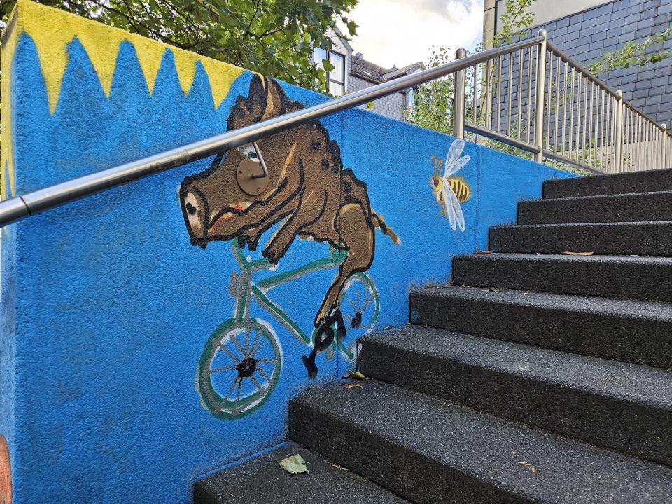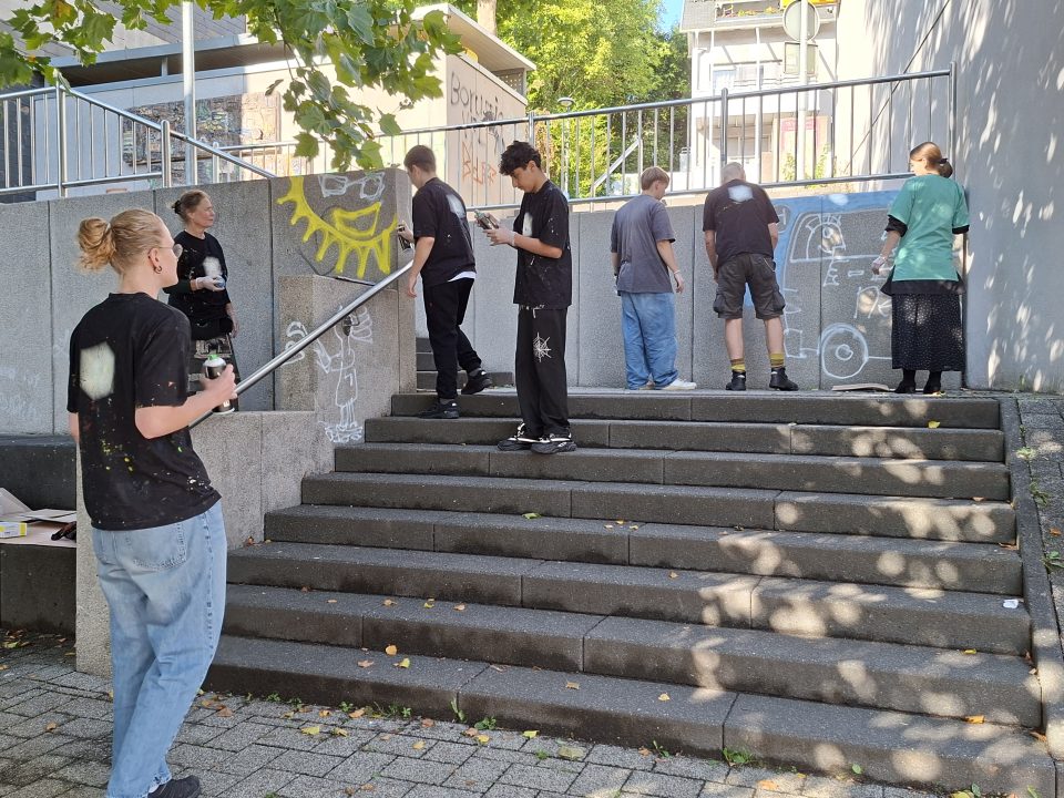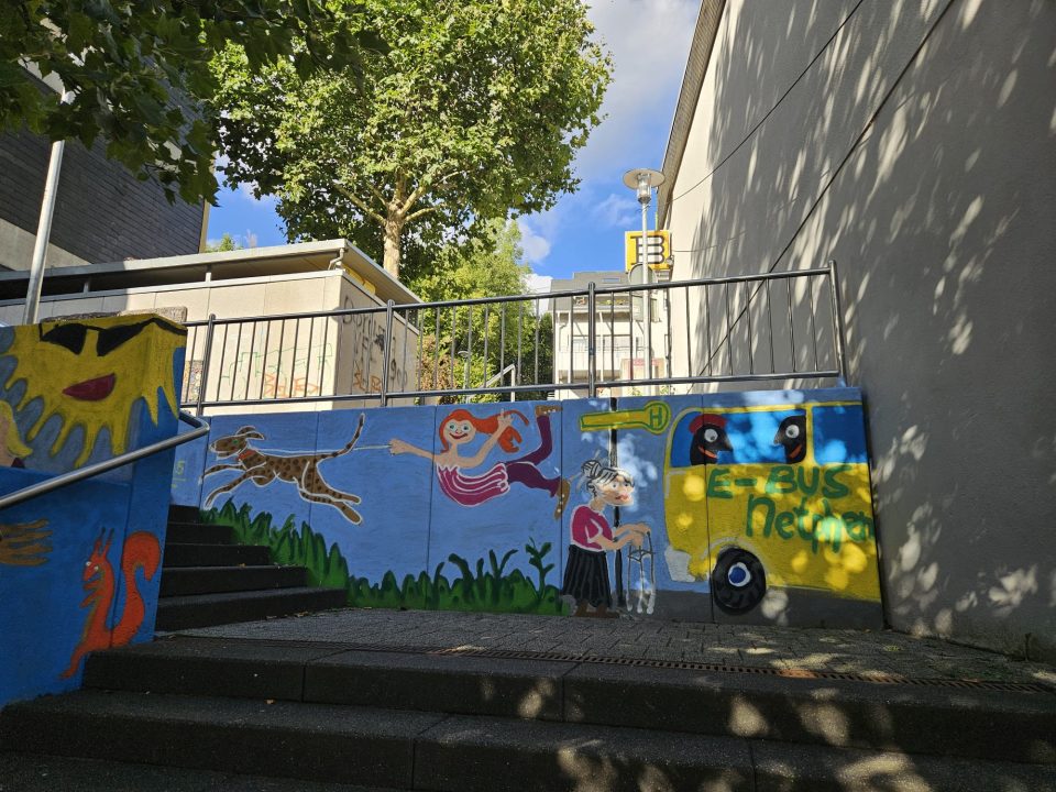 (wS/ne) Netphen 01.10.2025 | Während der Europäischen Mobilitätswoche (EMW) fand eine besondere Aktion in Netphen statt: Ein Graffiti-Projekt zur Verschönerung der „grauen Wände“ in der Stadtmitte. Entstanden ist dabei ein buntes und auffälliges Kunstwerk mit Bezug zu den Themen Mobilität, Umweltschutz, Diversität und Inklusion. Das Graffiti soll dazu dienen, die Treppenanlage am Verbindungsweg zwischen Lahnstraße und Neumarkt aufzuwerten und attraktiver zu gestalten. Gleichzeitig soll die Umgebung einladender wirken, damit mehr Menschen dazu animiert werden, sich gerne an diesem Platz aufzuhalten. Anstoß hierzu gab der Fußverkehrs-Check 2024, bei dem das Planungsbüro VIA die Verschönerung der Wege als Maßnahme vorgeschlagen hatte.