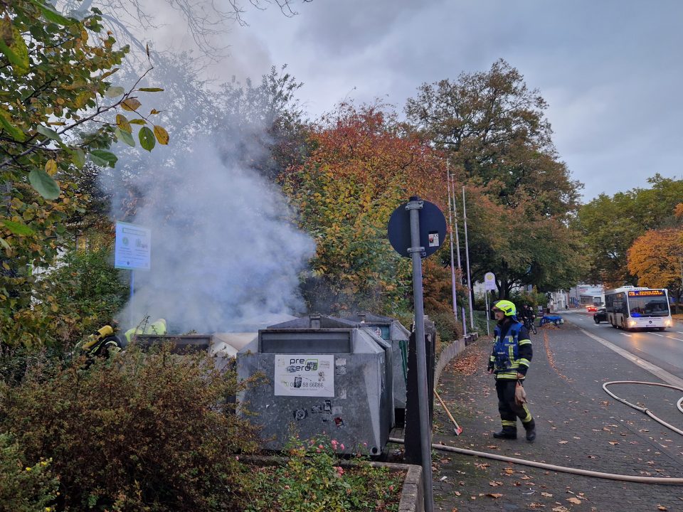 (wS/red) Siegen 15.10.2025 | Am Mittwochnachmittag, gegen 18:10 Uhr, musste die Bismarckstraße in Höhe des Hallenbads kurzzeitig voll gesperrt werden. Grund dafür war ein Papiercontainer, der in Brand geraten war.
