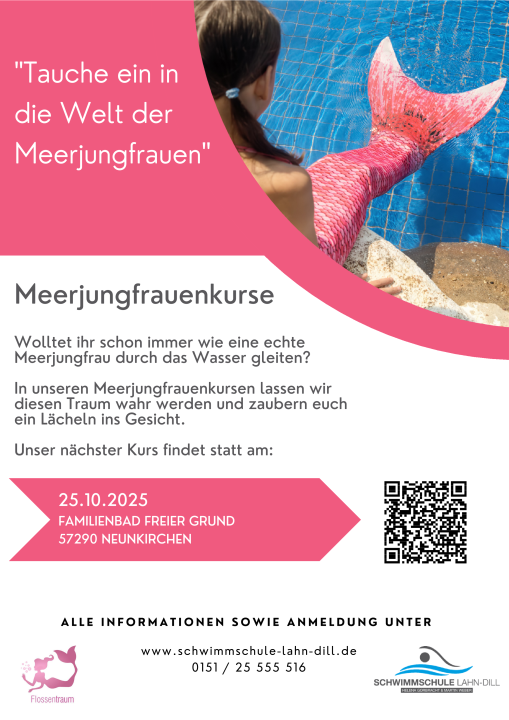 (wS/ne) Neunkirchen 18.10.2025 | Wer schon immer einmal wie eine Meerjungfrau durchs Wasser gleiten wollte, hat jetzt Gelegenheit dazu: Am 25. Oktober bietet die Schwimmschule Lahn-Dill im Familienbad Freier Grund einen ganz speziellen Kurs zum Erlernen des Schwimmens mit der Monoflosse an. Teilnehmen kann, wer mindestens sechs Jahre alt und im Besitz des Bronze-Abzeichens ist. Um 10:15 Uhr startet der erste Kurs.