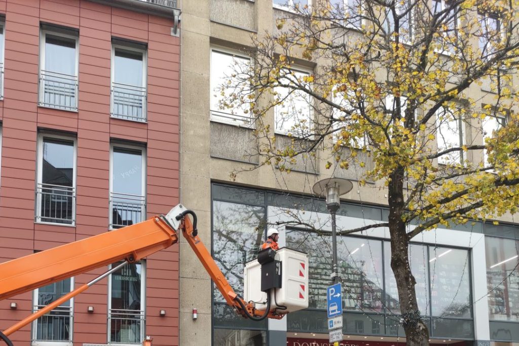 (wS/si) Siegen 23.10.2025 | In der Siegener Innenstadt haben die Fachleute aktuell mit der Montage der Winterbeleuchtung begonnen: Mit Hilfe von Hebebühnen werden gleichmäßig Lichterketten in den Ästen der Bäume verteilt und auch golden leuchtende Sterne sind schon an den Laternen zu sehen. Wenn die Arbeiten abgeschlossen sind, leitet eine „Lichtspur“ aus schimmernden Wintermotiven, Lichterketten und Straßenüberspannungen von der Bahnhofstraße hoch in die Oberstadt.