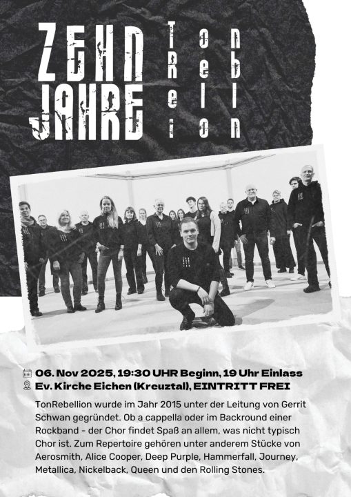 (wS/red) Kreuztal 16.10.2025 | Der Chor TonRebellion feiert sein zehnjähriges Bestehen – und lädt zu einem ganz besonderen Konzert ein. Am Donnerstag, den 6. November 2025, heißt es ab 19:30 Uhr (Einlass 19 Uhr) in der Evangelischen Kirche Eichen (Kreuztal): Bühne frei für zehn Jahre geballte Chorpower! Der Eintritt ist frei.