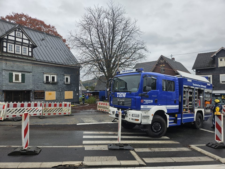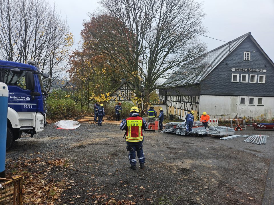 Die Bauaufsicht der Stadt Kreuztal übernahm daraufhin die Koordination der Sicherungsmaßnahmen in enger Abstimmung mit dem Eigentümer. Seit Samstagmorgen (1. November) ist das THW mit rund 40 Einsatzkräften vor Ort. Unterstützt wird der Einsatz vom THW-Ortsverband Olpe, dessen Trupp „Einsatzsicherungssystem“ die Sicherheit der Einsatzkräfte überwacht.