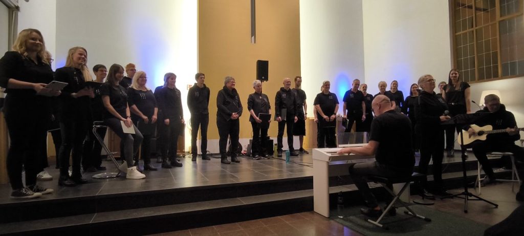 aktuellen Repertoire im fast bis auf den letzten Platz gefüllten Kirchenschiff auf. Unter der seit Chorbeginn währenden Leitung von Gerrit Schwan und von ihm am Piano begleitet. präsentierte er bekannte Rock- und Hardrock-Klassiker in ungewohnten, aber umso eindrücklicheren Chorversionen und mit fein abgestimmtem, vierstimmigem Gesang.