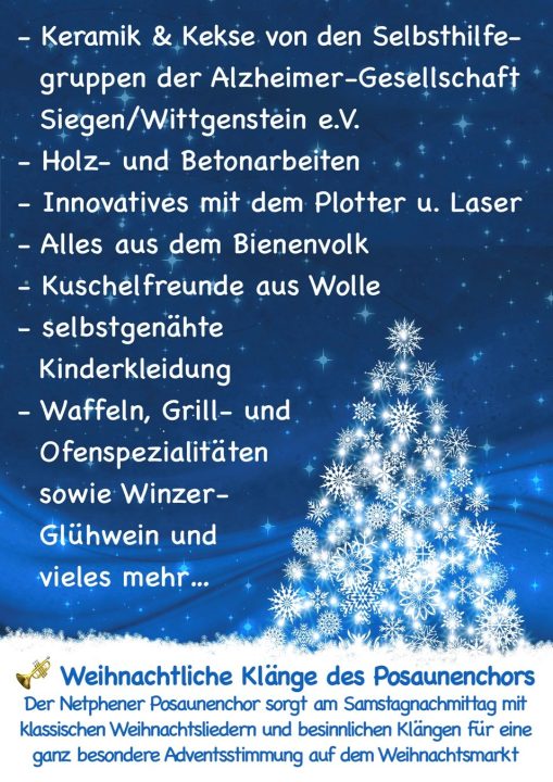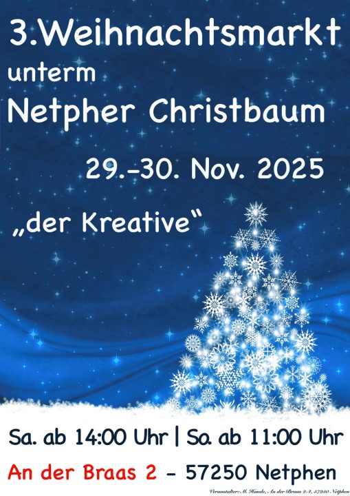 (wS/bs) Netphen 25.11.2025 | Am 29.11., ab 14 Uhr, und am 30.11.2025, ab 11 Uhr, findet wieder ein kleiner, gemütlicher und stimmungsvoller Weihnachtsmarkt in Netphen – Umgehungsstraße – An der Braas 2 – statt.