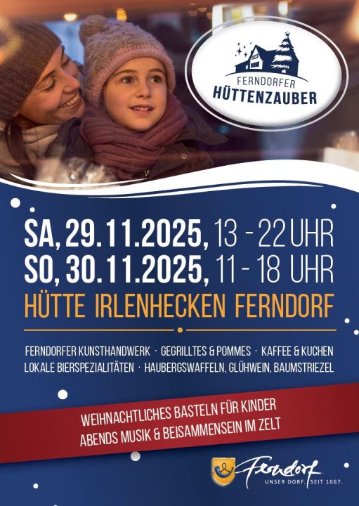 Der Verein zur Pflege der Dorfgemeinschaft in Ferndorf freut sich auf viele Besucherinnen und Besucher in Irlenhecken und lädt herzlich dazu ein, den Start in die Adventszeit gemeinsam zu feiern. Der Hüttenzauber soll nicht nur ein Markt sein, sondern ein Ort der Begegnung – für Jung und Alt, für Gäste und Ferndorfer, für alle, die sich auf die schönste Zeit des Jahres einstimmen möchten.