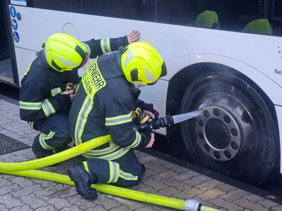 Nach ersten Informationen hatten sich kurz hinter dem Kreisel die Bremsen des Busses blockiert. Infolgedessen stieg Qualm aus dem Bereich der Räder auf. Die alarmierte Feuerwehr rückte mit mehreren Einsatzkräften an, löschte die Räder vorsorglich mit Wasser ab und kühlte sie herunter.
