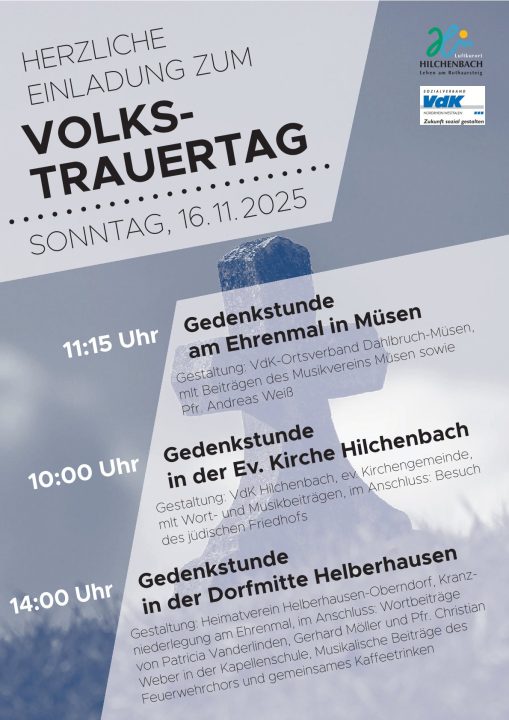 (wS/hi) Hilchenbach 06.11.2025 | Die VdK-Ortsverbände, die Stadt Hilchenbach und der Heimatverein Helberhausen- Oberndorf sowie weitere Mitwirkende laden am Sonntag, 16. November 2025, zu den Veranstaltungen zum Volkstrauertag ein, um gemeinsam den Opfern von Krieg und Gewaltherrschaft zu gedenken.
