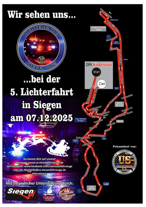 (wS/red) Siegen 30.11.2025 | Funkelnde Einsatzfahrzeuge, leuchtende Weihnachtsmotive und fröhliche Gesichter: Am 7. Dezember 2025 findet in Siegen die 5. Lichterfahrt statt. Präsentiert wird das stimmungsvolle Event von US-Einsatzfahrzeuge e.V., die erneut mit einer festlich geschmückten Kolonne durch die Stadt ziehen.