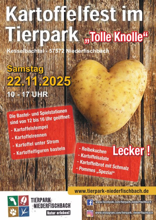 Niederfischbach, 18.11.2025– Der Tierpark Niederfischbach lädt in diesem Jahr herzlich zum Kartoffelfest „Tolle Knolle!“ ein. Die Veranstaltung findet am Samstag, den 22. November, von 10 bis 17 Uhr im idyllischen Kesselbachtal statt.