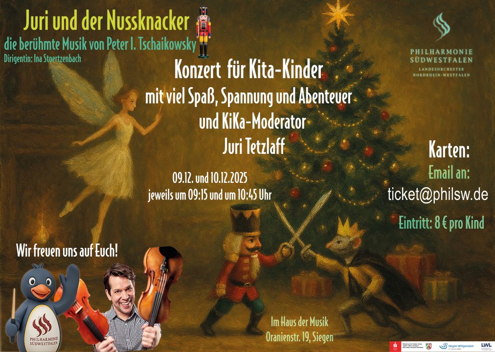 (wS/ph) Siegen 24.11.2025 | Nach dem erfolgreichen Start von „Klassik für Entdecker – Konzerte für Kitas“ mit Smetanas „Die Moldau“ im November setzt die Philharmonie Südwestfalen ihre neue Exklusiv-Reihe für Kinder fort: Gemeinsam mit KiKA-Moderator Juri Tetzlaff erzählt das Orchester im Dezember „Juri und der Nussknacker“ – ein kompaktes Mitmach-Konzert, das Kinder ab 3 Jahren unmittelbar in die Welt der Orchestermusik führt. Ein Vormittag, an den man sich erinnert – auch noch als Erwachsener.