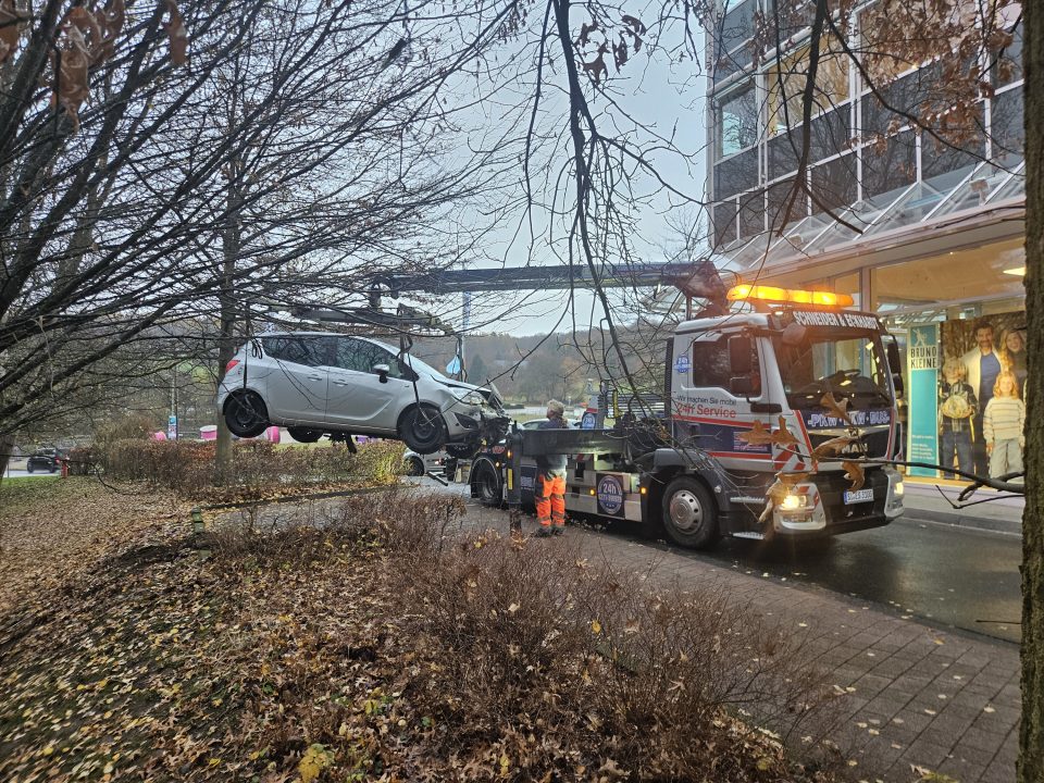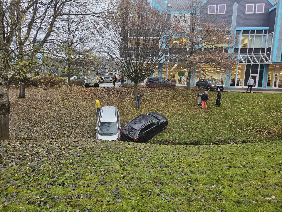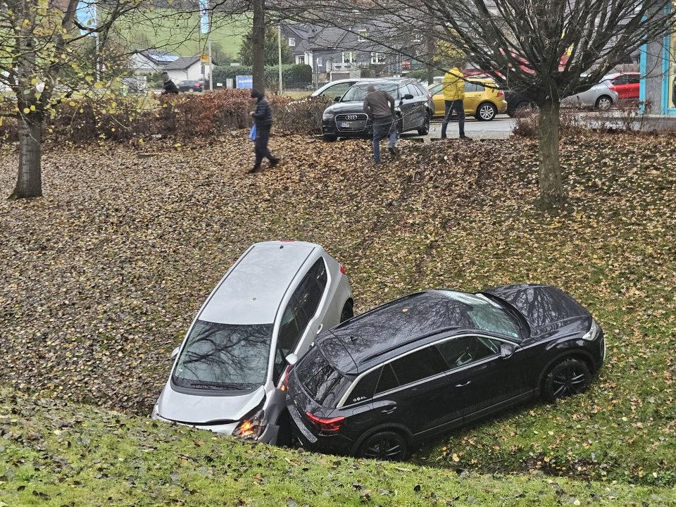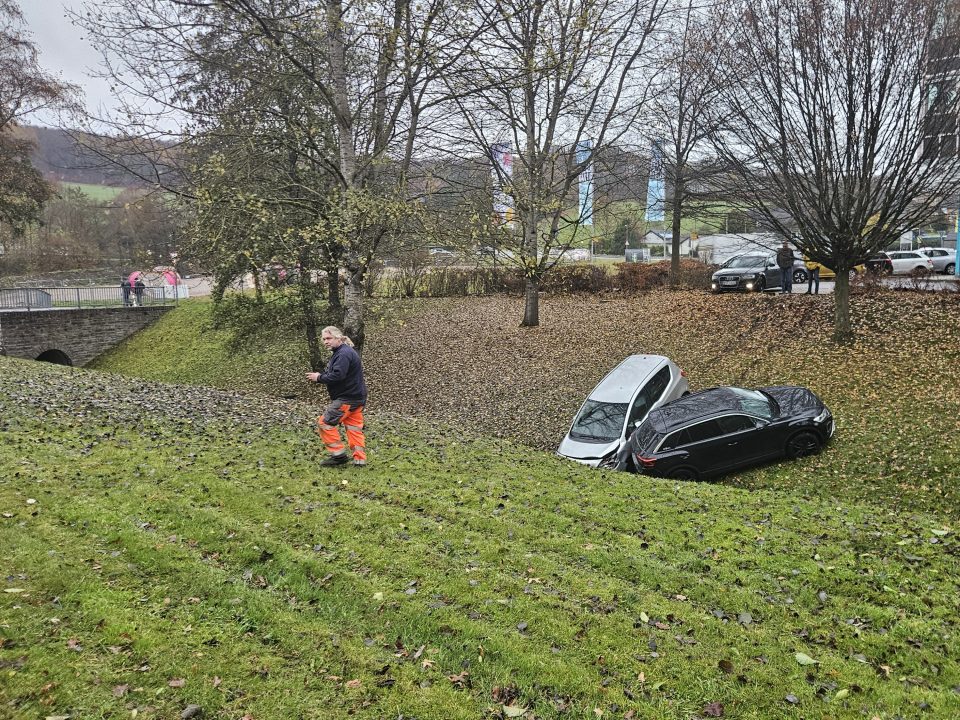 Eine 77-Jährige war gegen 13:50 Uhr auf dem Parkplatz eines Geschäfts an der Hagener Straße unterwegs. Aus noch ungeklärter Ursache beschleunigte sie plötzlich und prallte gegen einen geparkten PKW. Durch die Wucht des Aufpralls gerieten beide Fahrzeuge über einen Bordstein in die angrenzende Böschung. Von dort aus rutschten die Autos in den Bachlauf. Bei dem Unfall wurde zudem ein weiterer geparkter PKW leicht beschädigt.