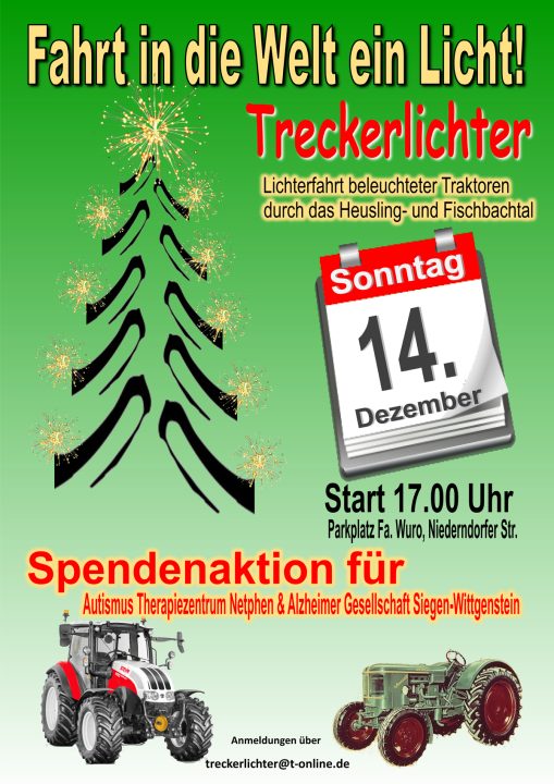 (wS/red) Freudenberg 27.11.2025 | Auch in diesem Jahr heißt es wieder: „Fahrt in die Welt ein Licht!“ – denn am Sonntag, 14. Dezember, rollt die beliebte Lichterfahrt beleuchteter Traktoren durch das Heusling- und Fischbachtal. Was als stimmungsvolles Gemeinschaftsprojekt begann, hat sich inzwischen zu einer festen Größe in der Vorweihnachtszeit entwickelt – und zu einer beeindruckenden Spendenaktion.
