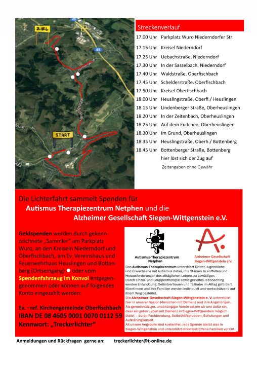 Der Startschuss fällt um 17.00 Uhr auf dem Parkplatz der Firma Wuro in der Niederdorfer Straße. Von dort aus führt der rund zwei Stunden lange, im Flyer detailliert dargestellte Streckenverlauf durch Niederdorf, Oberfischbach, Oberheuslingen, Heuslingen und Bottenberg. Entlang der Route sorgen die festlich beleuchteten Traktoren für weihnachtliche Atmosphäre und begeistern Jahr für Jahr zahlreiche Zuschauerinnen und Zuschauer.