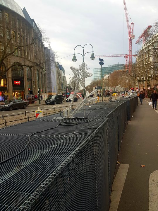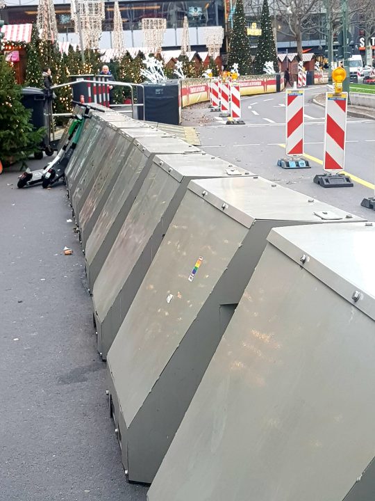 Seit etwa der Saison 2016/17 werden in Deutschland Weihnachtsmärkte regelmäßig mit schweren Sperren oder Fahrzeugsperren gesichert – als Reaktion auf den Anschlag in Berlin 2016 und die erhöhte Terror- und Gefährdungslage. Die Maßnahmen wurden danach systematisch weiterentwickelt. Fotos: Andreas Trojak (Berlin)