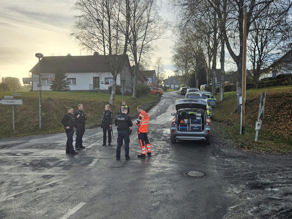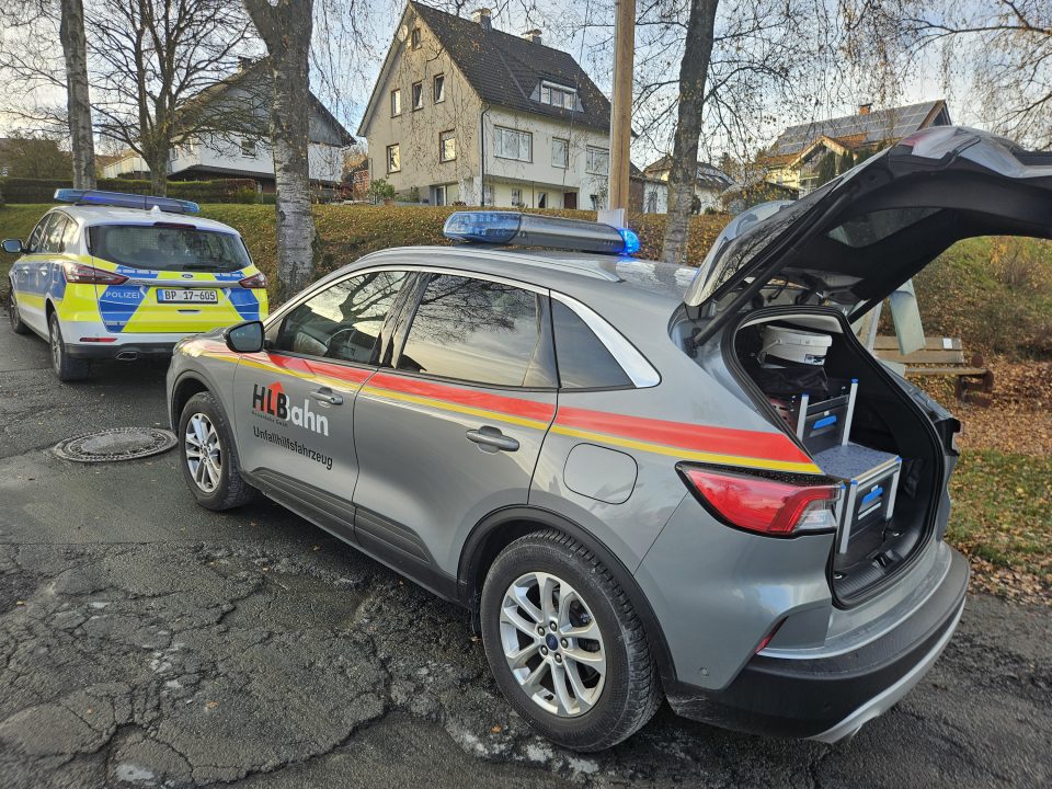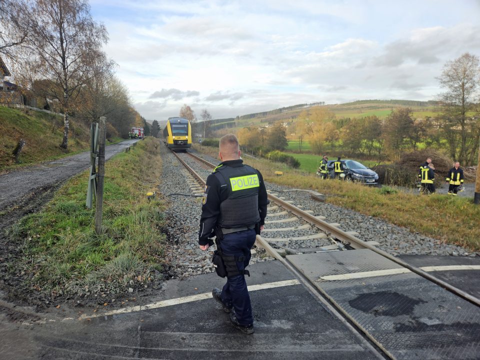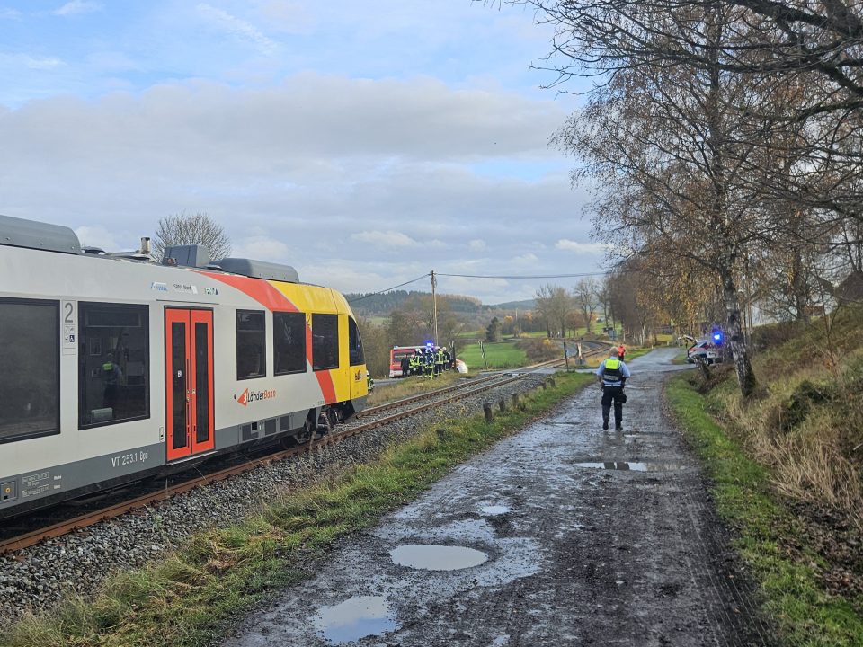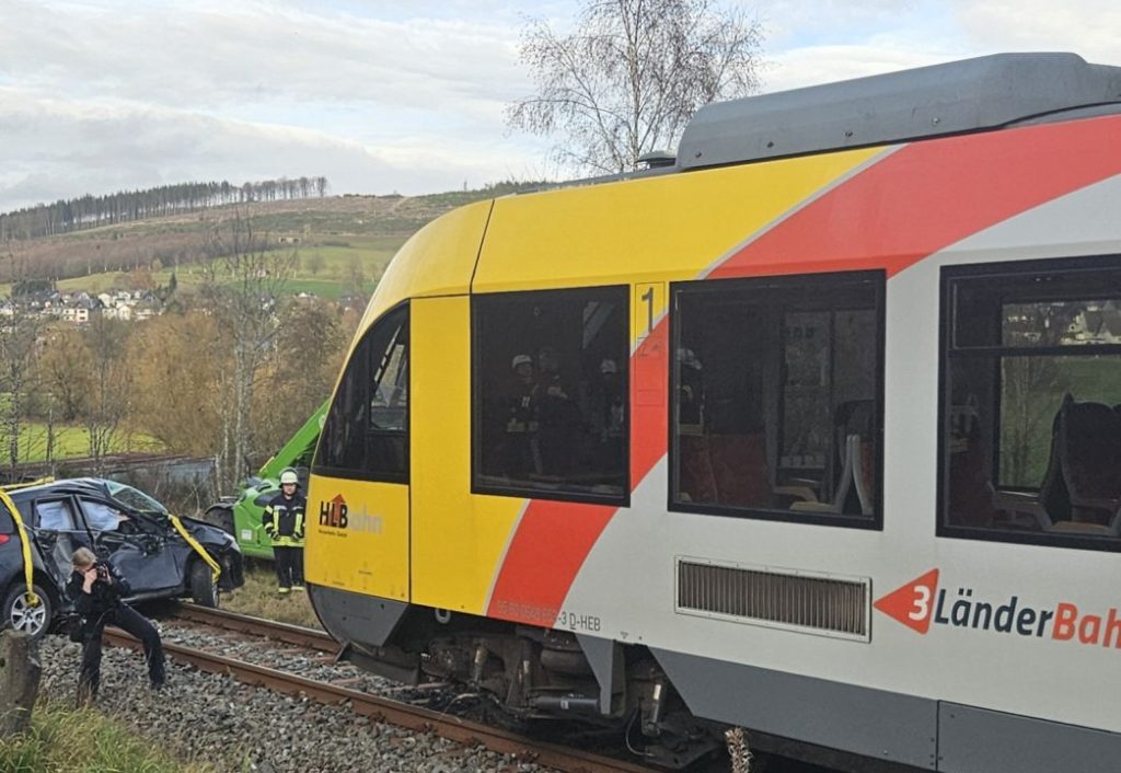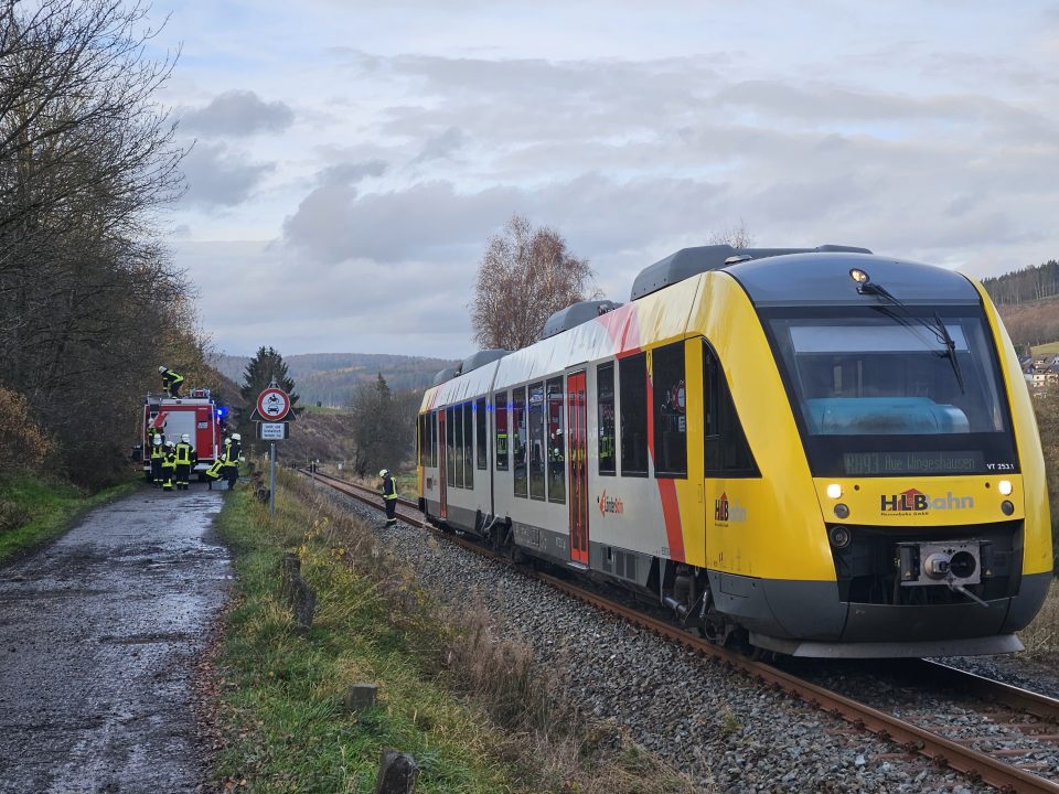 (wS/red) Erndtebrück 15.11.2025 | Im Bereich der Womelsdorfer Mühle bei Erndtebrück ist es am frühen Nachmittag zu einem Unfall an einem unbeschrankten Bahnübergang gekommen. Ein Regionalzug der HLBahn , der von Erndtebrück in Richtung Aue unterwegs war, kollidierte mit einem Toyota Auris, der auf die Gleise gefahren war. Das Auto wurde einige Meter weit über die Schienen mitgeschleift, bevor der Zug zum Stehen kam.
