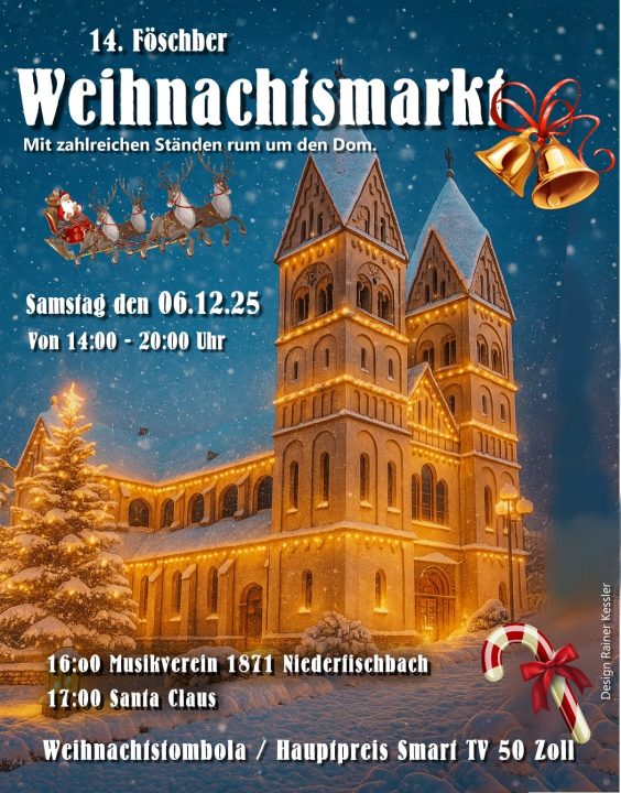 (wS/rk) Niederfischbach 06.12.2025 | Am Samstag, den 06. Dezember 2025, stimmt man sich auf Weihnachten ein – beim 14. Föschber Weihnachtsmarkt rund um den Siegerländer Dom. In Absprache mit Bürgermeister Dominik Schuh sowie dem Organisationsteam des Fördervereins Haus Mutter Teresa, vertreten durch Klaus-Jürgen Griese und Rainer Kessler, wird der Weihnachtsmarkt auf der Domplatte des Siegerländer Doms von 14:00 bis 20:00 Uhr stattfinden.