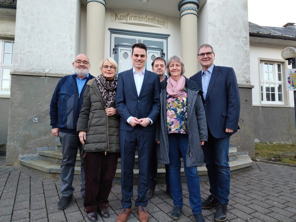 Sie freuen sich, dass für die Kirchenimmobilien in der Burbacher Ortsmitte eine gute Lösung gefunden wurde (v.l.n.r.): Baukirchmeister Christoph Klein, Finanzkirchmeisterin Jutta Horwath, Bürgermeister Jonas Becker, Pastor Martin Ditthardt, Dorothee Klein, stellv. Vorsitzende des Presbyteriums, und Pastor Jochen Wahl, Vorsitzender des Presbyteriums.
