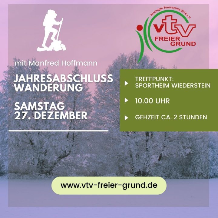 (wS/vtv) Neunkirchen 15.12.2025 | Der VTV Freier Grund lädt herzlich zur traditionellen Jahresabschlusswanderung ein. Am Samstag, den 27. Dezember, treffen sich alle Wanderfreunde um 10 Uhr am Sportheim in Wiederstein.