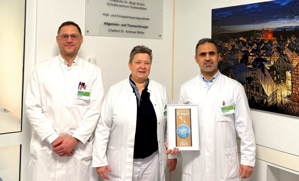 (wS/dia) Freudenberg 11.12.2025 | Zum vierten Mal in Folge hat die Orthopädische Klinik am Diakonie Klinikum Bethesda in Freudenberg in Sachen Schulterchirurgie das Endoprothesen-Siegel in Gold erhalten. Die „D-A-CH Vereinigung für Schulter- und Ellenbogenchirurgie“ (DVSE)bescheinigt dem Team um Chefärztin Dr. Birgit Schulz damit eine hohe Expertise. Das Siegel gilt als die höchste objektive Qualitätsstufe im Bereich der Schulterendoprothetik. Die Freude bei Dr. Birgit Schulz, die auch das Schulterzentrum Südwestfalen in Freudenberg leitet, ist groß: „Diese Auszeichnung ehrt uns sehr.“ Kurse, Weiterbildungen, jahrelange Praxis und mehr als 700 Eingriffe am Schulter- und Ellenbogengelenk pro Jahr: Viel Arbeit hat das Team um Dr. Schulz investiert, um das Siegel in Empfang nehmen zu können.