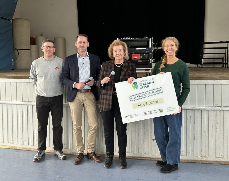 VTV-Vorstandssprecher Bastian Moritz, Bürgermeister Marco Schwunk, die 1. Vorsitzende des Regionalvereins LEADER-Region 3-Länder Eck, Roswitha Still, und Regionalmanagerin Verena Landau freuen sich über die technische Aufwertung der Mehrzweckhalle Salchendorf.