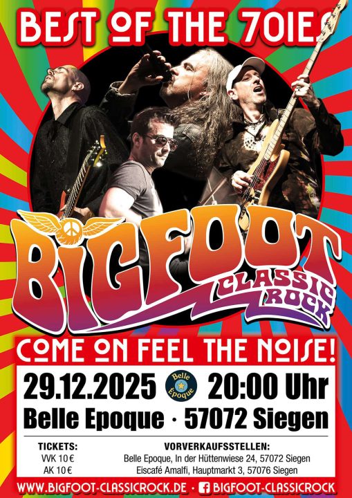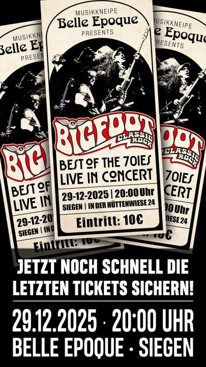 (wS/red) Siegen 28.12.2025 | Die Belle Époque ist seit vielen Jahren ein fester Treffpunkt für Musikliebhaber, Genießer und Freunde guter Gesellschaft in Siegen. Als Ort, an dem Musik, Kultur und Geselligkeit aufeinandertreffen, steht hier nun ein besonderes Highlight bevor: Am 29. Dezember 2025 verwandelt die Band BIGFOOT Classic Rock die Bühne in eine Zeitkapsel der Rockgeschichte.