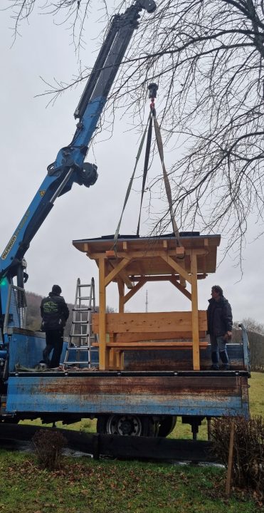 (wS/tg) Netphen 09.12.2025 | Pünktlich zum Nikolaustag lieferte die Zimmerei Georg Sting aus Netphen-Salchendorf eine überdachte Sitzgarnitur, die mit gemeinwohlorientierten Mitteln – davon 70 % Sparkassenfördermittel – finanziert werden konnte.