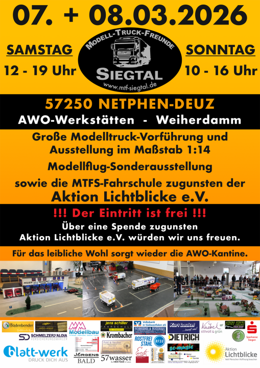 (wS/red) Netphen 24.01.2026 | Am Wochenende 7. und 8. März 2026 lädt der Verein Modell-Truck-Freunde Siegtal zu einer großen Modelltruck-Veranstaltung in die AWO-Werkstätten am Weiherdamm in Netphen-Deuz ein. Besucherinnen und Besucher dürfen sich auf eine eindrucksvolle Ausstellung und Vorführung von detailgetreuen Modellfahrzeugen freuen.