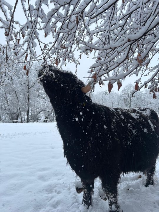 „Tatsächlich sind auch die meisten Mutterkühe jetzt im Stall, da sie draußen kein Futter mehr finden und werden deshalb genauso geschützt wie Milchkühe. Sie gedeihen im Offenstall am besten und wir halten die Tränken mit Heizspiralen offen.