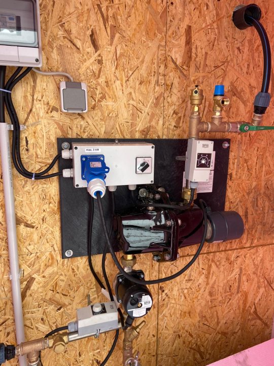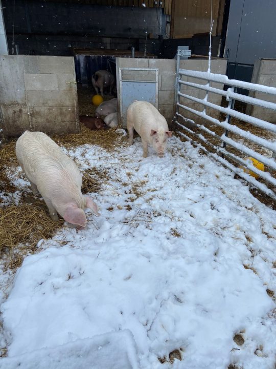 „Die Schweine können frei wählen, ob sie im Stall bleiben oder an die frische Luft gehen und sie sind auch bei Schnee gerne draußen (s. Foto). Wobei frische Luft das Zauberwort für Schweine ist, die warmen, ammoniakgefüllten Ställe von früher gehören definitiv der Vergangenheit an. Mit einem Umlaufsystem (mit angeschlossenem Durchlauferhitzer, s. Foto) und Begleitheizungen an den Tränken ist die Wasserversorgung gesichert. Mit einer „Mikroklimakiste“ sorgen wir für ein warmes Nest: Eine große Holzkiste ist oben mit einer Kokosmatte isoliert und am Ausgang mit Streifenvorhängen (ähnlich wie die Fliegenvorhängen, die man vom Zelt kennt) windgeschützt – so können sich die Tiere im täglich frischen Stroh nah nebeneinander legen um sich aufzuwärmen. Mit dieser Ausstattung ist die Kälte für uns kein Problem. Auffallend ist, dass die Futteraufnehme bei Minustemperaturen deutlich höher ist.“
