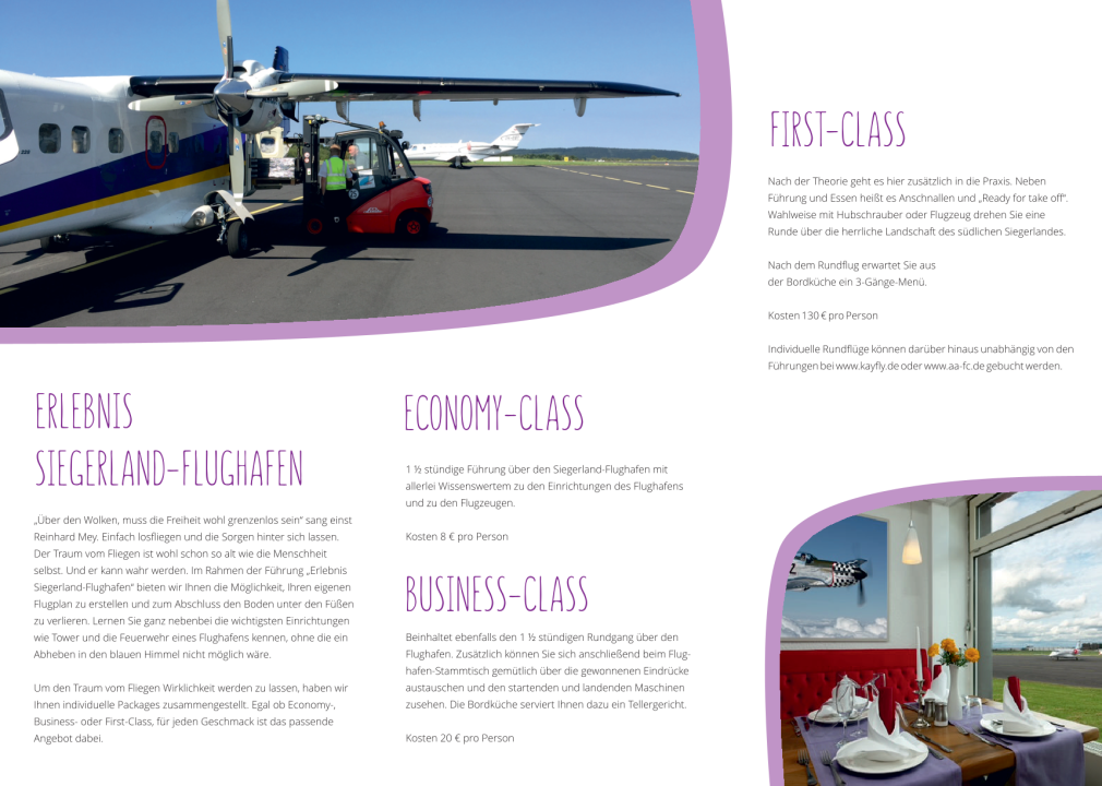 Die Economy-Class beinhaltet eine rund 90-minütige Führung über den Siegerland-Flughafen mit vielen interessanten Informationen zu den Flughafenanlagen und den Flugzeugen. Der Preis beträgt 8 Euro pro Person.