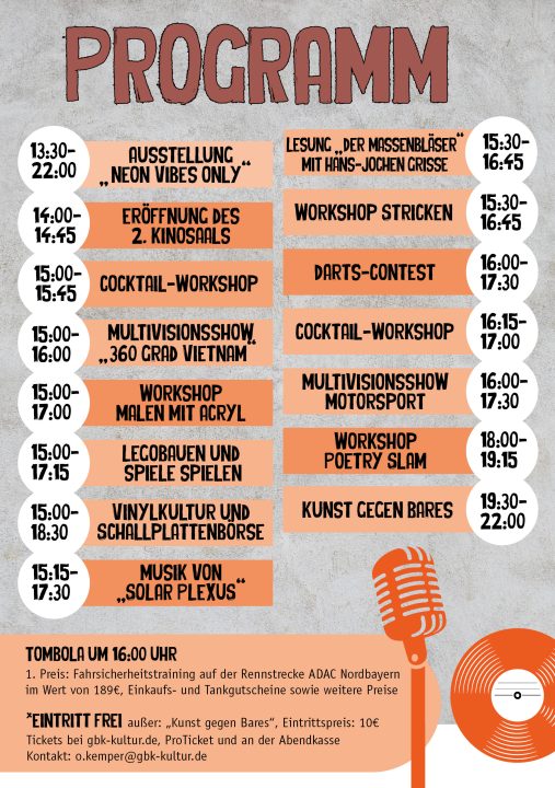 Gekrönt wird der Kulturmarkt der Möglichkeiten am Abend mit dem bekannten Format „Kunst gegen Bares“, bei dem Künstlerinnen und Künstler ihre Talente auf einer offenen Bühne vor Publikum präsentieren. Für diese Veranstaltung sind noch Tickets verfügbar. Diese können unter www.gbk-kultur.de, über ProTicket oder an der Abendkasse für zehn Euro erworben werden.