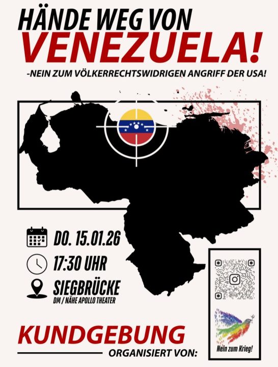 (wS/li) Siegen 12.01.2026 | Das Siegener Bündnis „Nein zum Krieg!“ ruft für Donnerstag, den 15. Januar 2026, zu einer öffentlichen Kundgebung unter dem Motto „Hände weg von Venezuela!“ auf. Die Veranstaltung beginnt um 17.30 Uhr auf der Siegbrücke vor dem dm-Markt in der Unterstadt von Siegen.